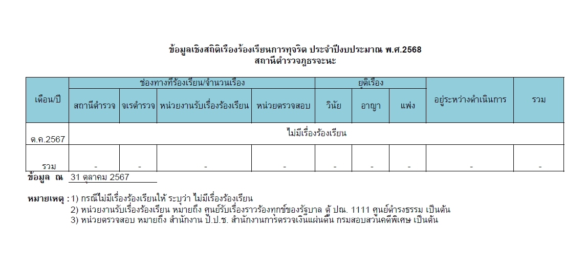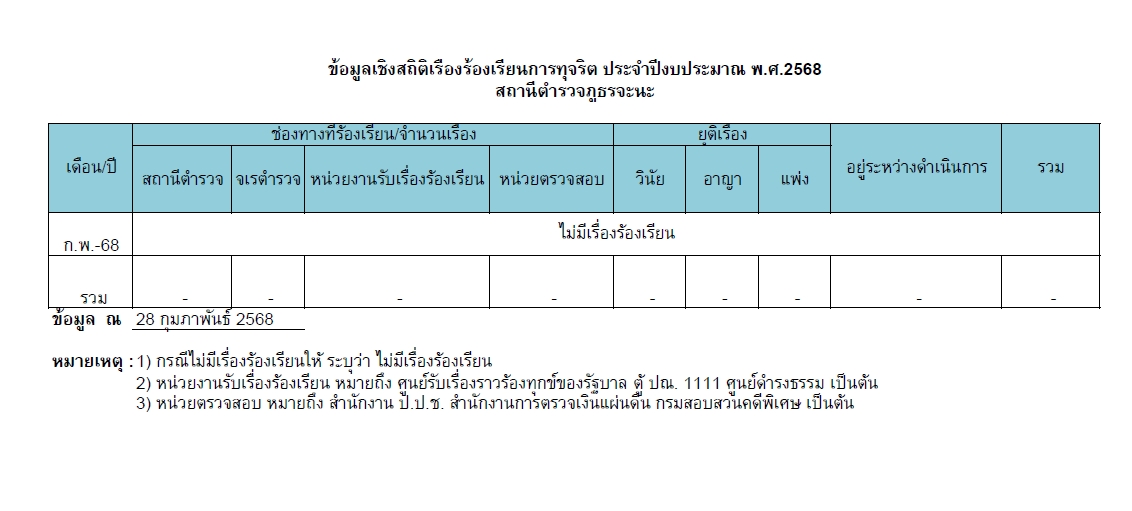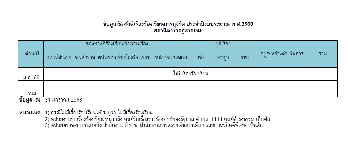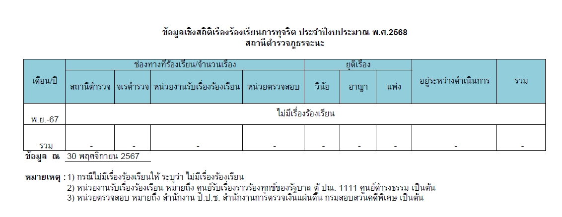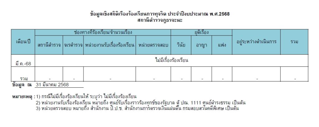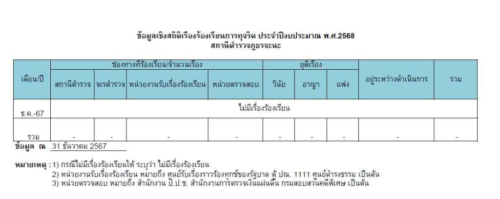 017ช่องทางแจ้งเรื่องร้องเรียนการทุจริตและข้อมูลเชิงสถติเรื่องร้องเรียนการทุจริต 5 มกราคม 2567 โดย admin / ไม่มีหมวดหมู่ Post Views: 60 Jaray Complaint Management System (JCoMS) คือ ระบบรับเรื่องร้องเรียน ร้องทุกข์ เรื่องทุจริตและประพฤติมิชอบ ของสำนักงานจเรตำรวจ ผ่านช่องทางเว็บไซต์ http://www.jcoms.police.go.th “ผู้แจ้งเบาะแสจะได้รับความคุ้มครองและรักษาเป็นความลับ” ช่องทางร้องเรียน ร้องทุกข์ (คลิ๊ก) ข้อมูลเชิงสถิติเรื่องร้องเรียนการทุจริตประจำปี ข้อมูลเชิงสถิติเรื่องร้องเรียนการทุจริตเดือน ต.ค.67 ประจำปีงบประมาณ 2568 ข้อมูลเชิงสถิติเรื่องร้องเรียนการทุจริตเดือน พ.ย.67ประจำปีงบประมาณ 2568 ข้อมูลเชิงสถิติเรื่องร้องเรียนการทุจริตเดือน ธ.ค.67ประจำปีงบประมาณ 2568 ข้อมูลเชิงสถิติเรื่องร้องเรียนการทุจริตเดือน ม.ค. 68ประจำปีงบประมาณ 2568 ข้อมูลเชิงสถิติเรื่องร้องเรียนการทุจริตเดือน ก.พ. 68ประจำปีงบประมาณ 2568 ข้อมูลเชิงสถิติเรื่องร้องเรียนการทุจริตเดือน มี.ค. 68ประจำปีงบประมาณ 2568 FacebookFacebookXXLINELine
