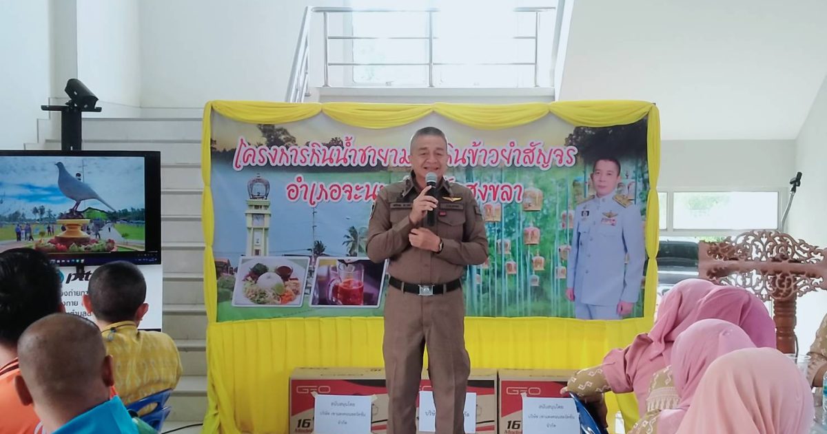 โครงการน้ำชายามเช้า 8 สิงหาคม 2566 โดย admin / ข่าวประชาสัมพันธ์,ข่าวประชาสัมพันธ์,ข่าวฝากประชาสัมพันธ์,ข่าวภารกิจผู้บังคับบัญชา Post Views: 1 8 ส.ค.66 เวลา 07.00 น.พ.ต.อ.พชรพล ณ นคร ผกก.สภ.จะนะ ร.ต.อ.หญิงพรทิพย์ แก้วชู รอง สวป./หน ชุด ตชส.สภ.จะนะ พร้อมชุด ตชส.สภ.จะนะ และ หน.ส่วนราชการ และทุกภาคส่วนเข้าร่วม โครงการกินน้ำชายามเช้ากินข้าวยำสัญจร โดยมี นาย กฤชณัทท พลรัตน์ นายอำเภอจะนะ เป็นประธาน ณ อบต.ตลิ่งชัน ม.3 จ.ตลิ่งชัน อ.จะนะ จว.สงขลา FacebookFacebookXXLINELine