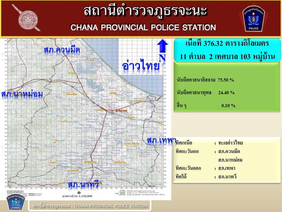ทิศตะวันตก ติดต่อกับเขต สภ.นาหม่อม และ เขต สภ.ควนมีด อ.จะนะ